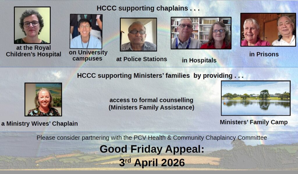The Good Friday Appeal will be held across the churches in Victoria on Friday 3rd April 2026. The appeal is being made in support of the wider work of the Health and Community Chaplaincy Committee in providing chaplains for hospitals, prisons, universities, police stations and the provision of pastoral care for our own ministry families.